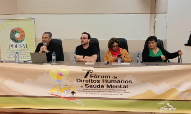 A terceira mesa, “Política de Drogas, Estado e Sociedade Civil: conjuntura latino-americana, diálogos e interlocuções”, trouxe um panorama crítico sobre a guerra às drogas. Pablo Cymerman (Associación Civil Intercambios – ARG) recuperou a história da redução de danos na América Latina e defendeu políticas intersetoriais para este debate amplo que envolve diversas questões sociais. Já Nathália Oliveira (Iniciativa Negra – SP) relacionou drogas e justiça climática, analisando a atuação do crime organizado na Amazônia e os impactos da política de armas no Brasil. Já Priscila Gadelha (Escola Livre de Redução de Danos e Renfa) falou sobre as redes de mulheres usuárias de drogas na América Latina e a luta por espaços de acolhimento e direitos. Na mediação, Francisco Netto (PDHSM – Fiocruz) enfatizou a necessidade de encontros regionais e a urgência de debates sobre diferentes substâncias como um contraponto à falida política de guerra às drogas.