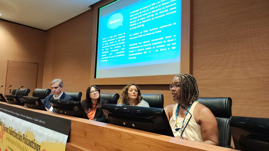 O primeiro painel do seminário foi moderado por Ana Paula Guljor e trouxe contribuições sobre o cenário emergente no Brasil. O painel contou com a participação de José Luiz Costa, da Unicamp; Camila Magalhães, da USP; Vânia Nogueira, coordenadora do CAPS-AD Heleno de Freitas; e Maria Angélica Comis, da REDUC.
